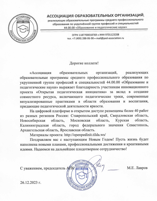 В связи с этим «Ассоциация образовательных организаций, реализующих образовательные программы среднего профессионального образования по укрупненной группе профессий и специальностей 44.00.00 «Образование и педагогические науки» (далее Ассоциация педагогических колледжей) поздравляет всех сотрудников и студентов педагогических колледжей и вузов с объявленным годом педагога и наставника и инициирует «Открытую педагогическую инициативу» в качестве образовательных активностей, которые будут интересны и востребованы студентами и преподавателями педагогических колледжей, вузов, воспитанниками и воспитателями дошкольных образовательных учреждений, младшими школьниками и учителями начальной школы, родителями, иными заинтересованными лицами.